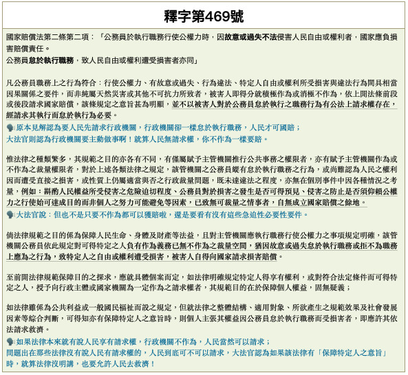 司法院大法官釋字第 469 號解釋,認為國家賠償法第 2 條第 2 項規定,並不以被害人對於公務員怠於執行之職務行為有公法上請求權存在,經請求其執行而怠於執行為必要。顯係採用下列何理論,並與公務員作為義務作進一步之連結?