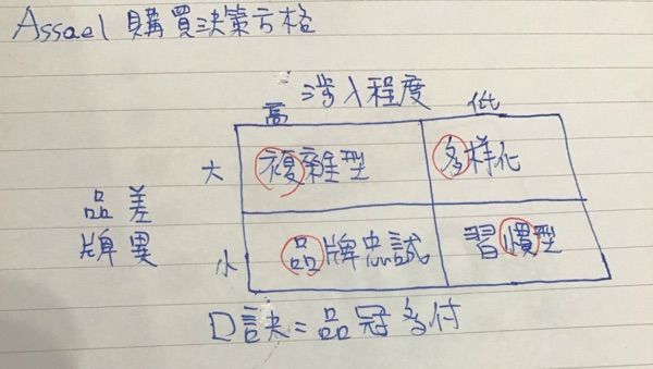 4. 尋求多樣化的購買行為:低度涉入+高差異。消費者經常做品牌轉換,原因並非對產品不滿意,而是因產品有多樣化選擇所導致。