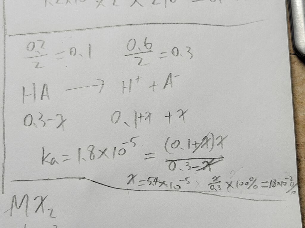 45.將0.2M的鹽酸與0.6M的醋酸水溶液等體積混合,求混合後醋酸的解離百分率為若干%?(CH3COOH之Ka=1.8×10-5)