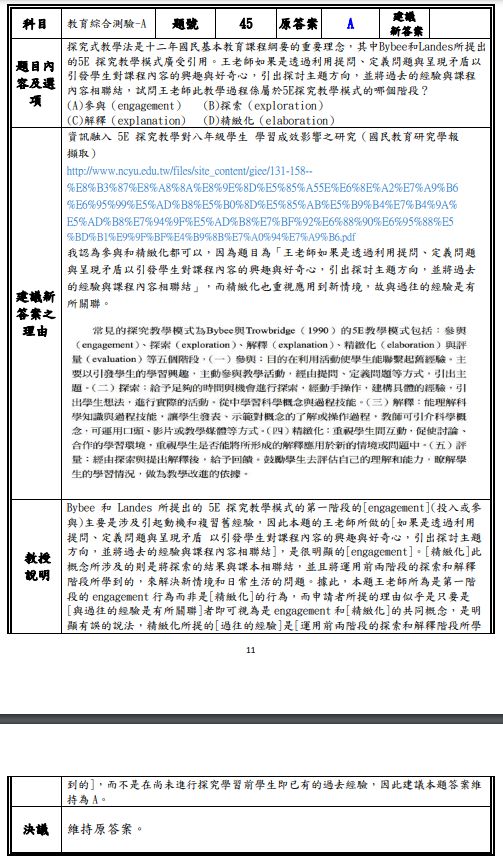 45.探究式教學法是十二年國民基本教育課程綱要的重要理念,其中 Bybee 和 Landes 所提出的 5E 探究教學模式廣受 引用。王老師如果是透過利用提問、定義問題與呈現矛盾 以引發學生對課程內容的興趣與好奇心,引出探討主題方 向,並將過去的經驗與課程內容相聯結,試問王老師此教 學過程係屬於 5E 探究教學模式的哪個階段?
