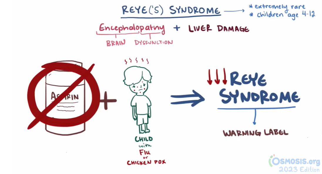 而 Reye’s syndrome則是一種病毒感染 (ex. 水痘 varicella, 流行性感冒 influenza)加上 Aspirin使用,產生交互作用所誘發的急性腦部 (腦水腫、腦壓升高)、肝臟病變 (肝功能異常、肝腫大、脂肪沉積),致病的原因可能為病毒感染造成的免疫反應,損害了線粒體功能和脂質代謝,Aspirin的使用會加劇此傷害,好發於 2個月至16歲的孩童。