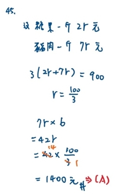 45. 一斤糖果與一斤豬肉的價格比為 2:7,小明各買 3 斤共花 900 元,若小明要