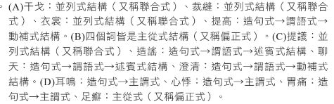 解析: (A)干戈:並列式結構(又稱聯合式)、裁縫:並列式結構(又稱聯合式)、衣裳:並列式結構(又稱聯合式)、提高:造句式→謂語式→動補式結構
