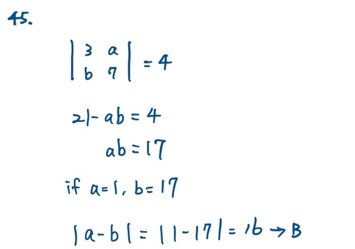 45. 已知a,b為整數,且行列式,請問絕對值 |a- b |為何? (A) 6 (B) 16 (C) 17 (D) 18