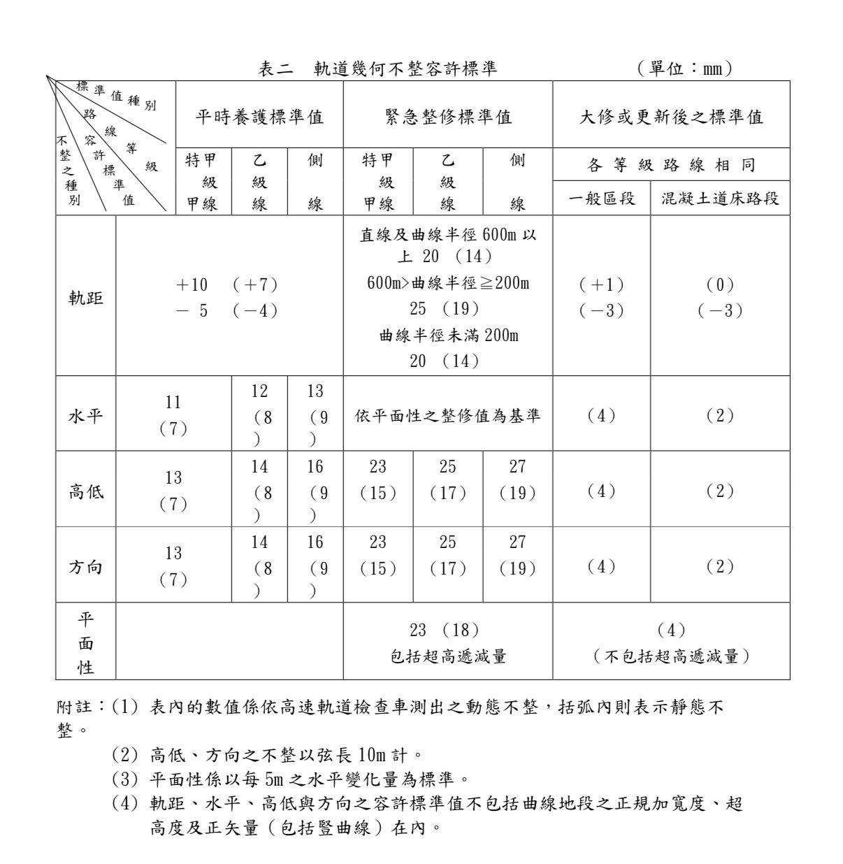 46 軌道養護依據不同路線等級和不整之種類有所差異,請問在平時養護時,特甲級線之水平動態不整的容許 標準值為何?