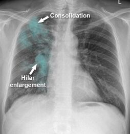 46.吳先生45歲,不抽菸,因咳嗽2個月至門診就醫,胸部X光檢查結果如圖所示,最可能的診斷為何?