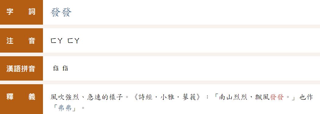 - 風吹強烈、急速的樣子。《詩經.小雅.蓼莪》:「南山烈烈,飄風發發。」也作「弗弗」。