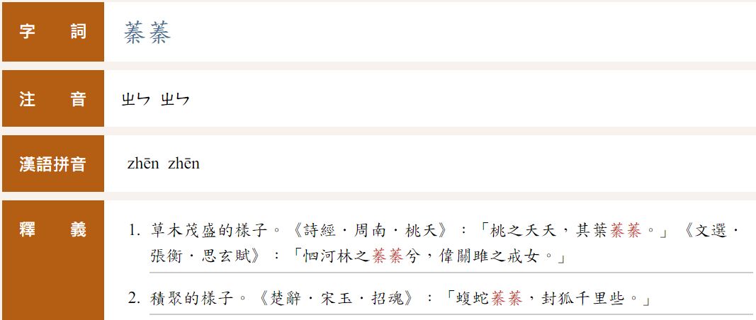 - 補充:積聚的樣子。《楚辭.宋玉.招魂》:「蝮蛇蓁蓁,封狐千里些。」
