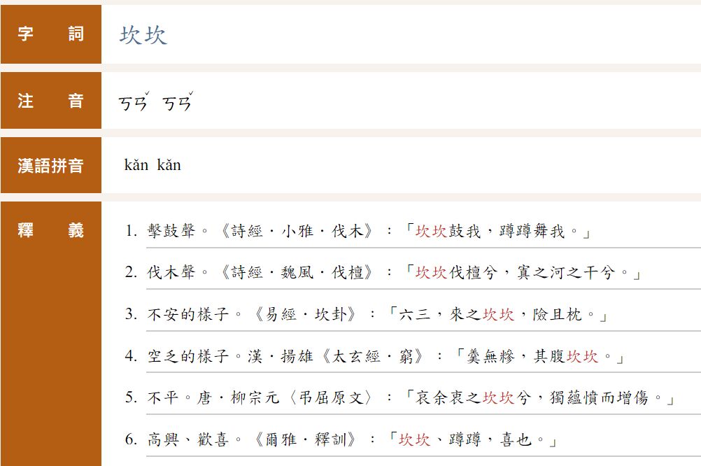 - 補充:伐木聲。《詩經.魏風.伐檀》:「坎坎伐檀兮,寘之河之干兮。」
