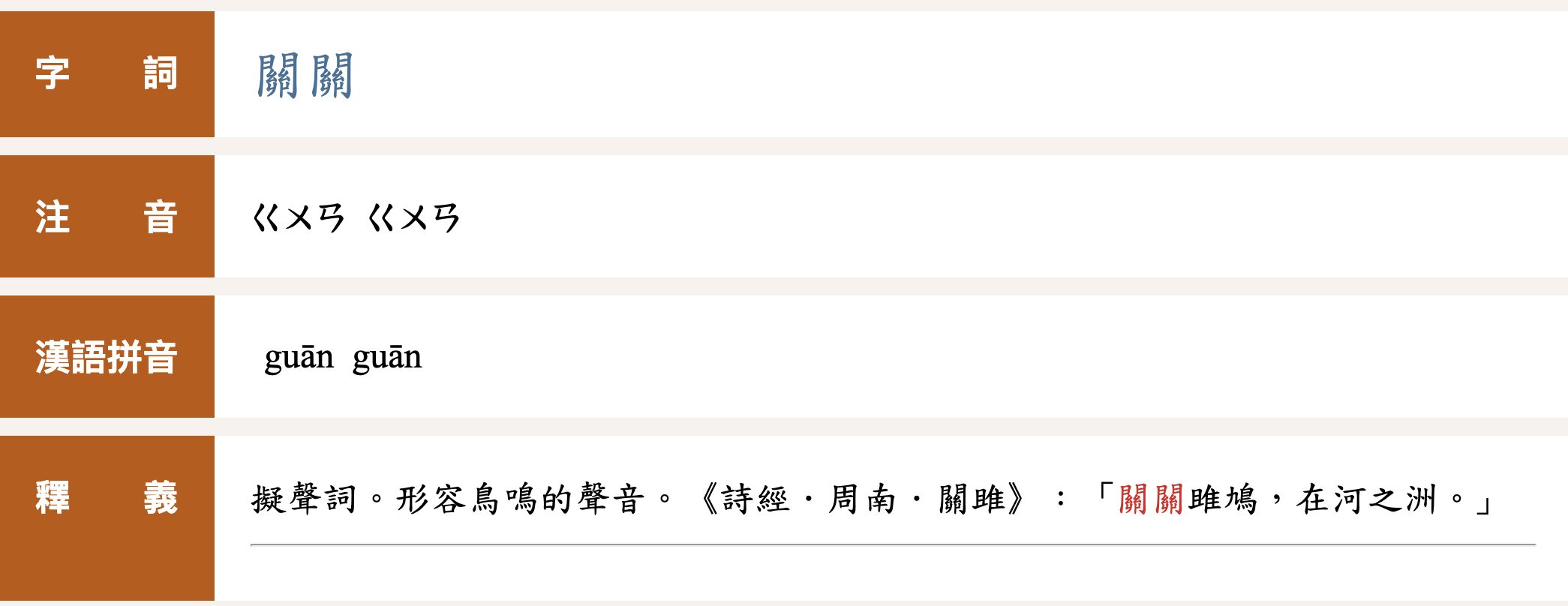 - 鳥鳴的聲音。《詩經.周南.關雎》:「關關雎鳩,在河之洲。」