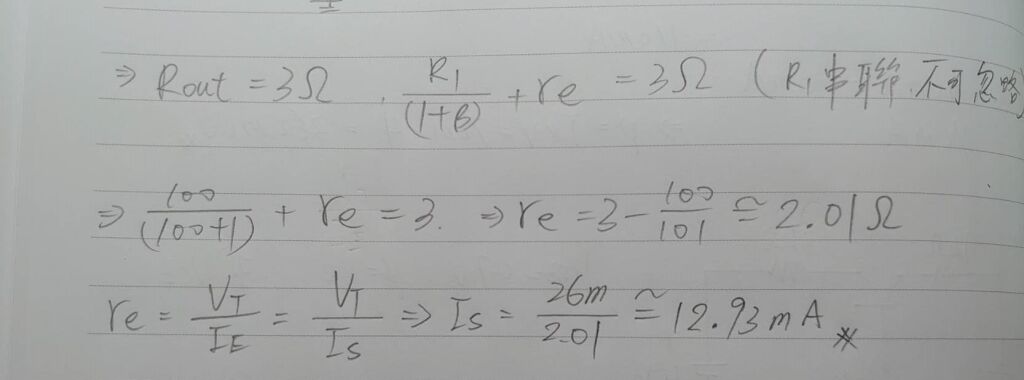 熱電壓(thermal voltage)VT =26mV,歐力電壓(Early voltage)VA =∞。若 Rout =3Ω,則 Is 值