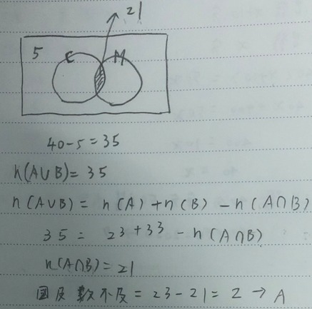 46. 某班有 40 位學生,其中國文及格的有 23 人,數學及格的有 33 人,國