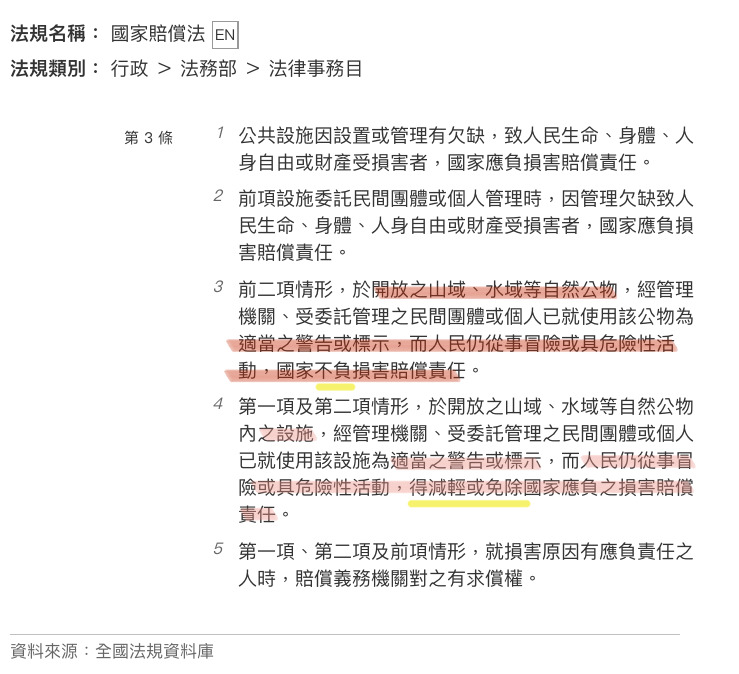 Ⅲ前二項情形,於開放之山域、水域等自然公物,經管理機關、受委託管理之民間團體或個人已就使用該公物為適當之警告或標示,而人民仍從事冒險或具危險性活動,國家不負損害賠償責任。