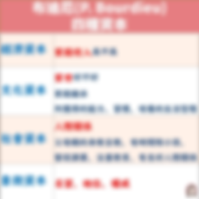 (C)小華來自富裕家庭,從小受的教育讓她能用多國語言與人溝通,是屬於社會資本 應該為文化資本 (D)某個美國長春藤大學在學術界的聲望與光環屬於社會資本。 應該為象徵資本