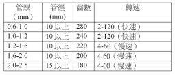 47. 如下表所示,手動金屬圓鋸機鋸切鋼管,鋸片外徑 275mm,管厚 1.5mm,管徑 20mm,轉速應為多少?