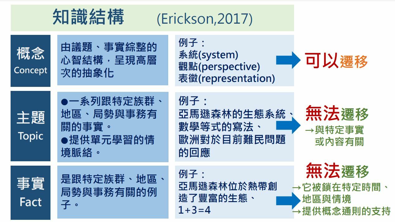 Erickson將知識分為理論、原理、通則、概念、主題以及事實,原理與通則乃屬同一層次,故共計分為五個層次。Banks將知識分為理論、概念、通則以及事實四類,理論為最高層次的知識,其餘依此類推,兩者都認為事實的知識是最低階的知識。另外,兩者對知識構造之看法還有兩個不同處,其一是Erickson在概念與事實之間加入了「主題」的層次,其二是Erickson將概念置於通則的層次之下。再者,Erickson等人基於對行為目標的反動明確區分概念通則與主題事實的不同,他們認為概念通則著重在綜合分析,而主題與事實則只能達到較低的認知層次,是屬於較傳統的設計方式。
