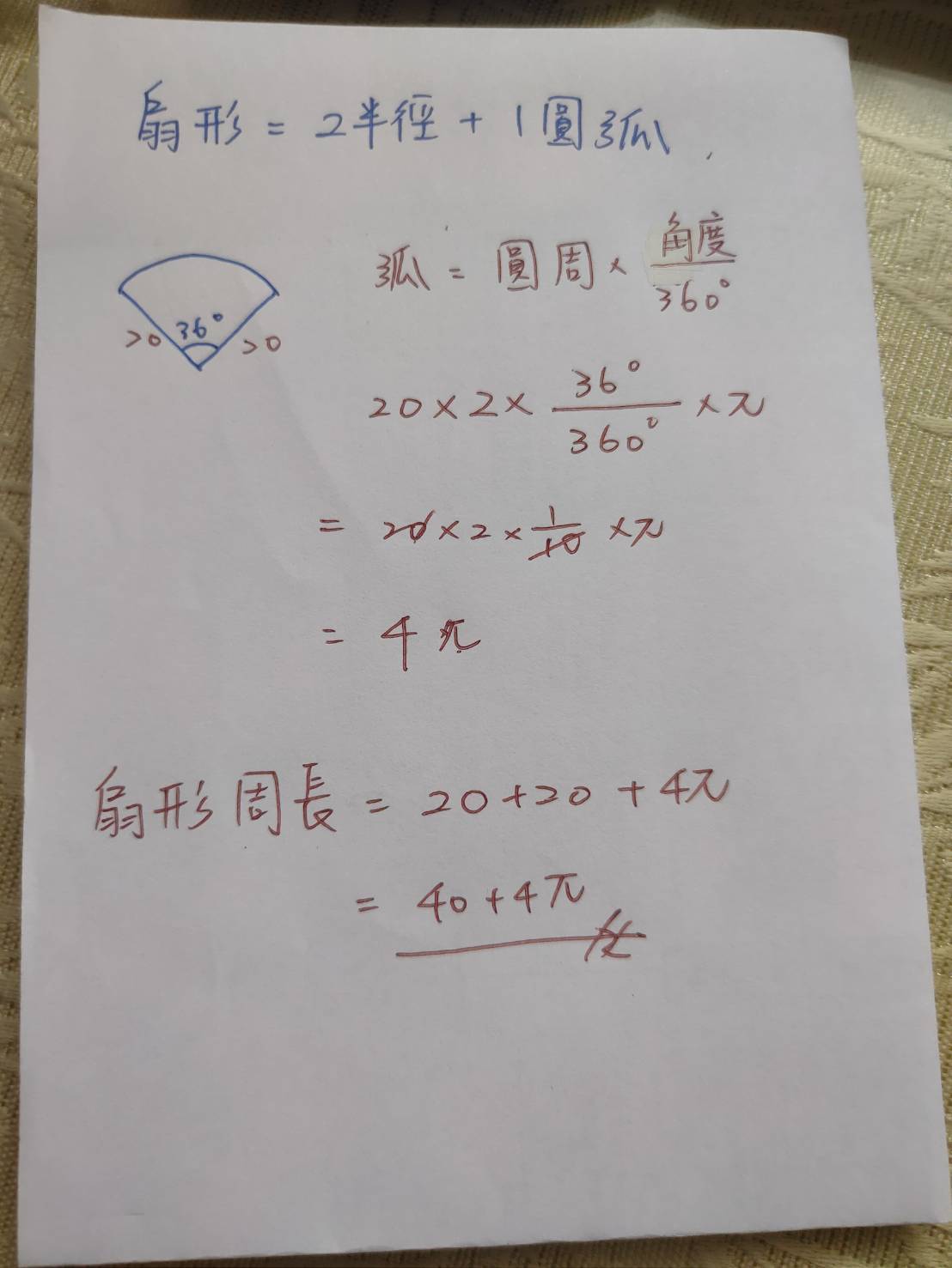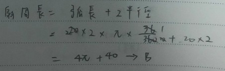 48. 在半徑為 20 公分的圓中,圓心角為 36˚的扇形周長為多少公分?