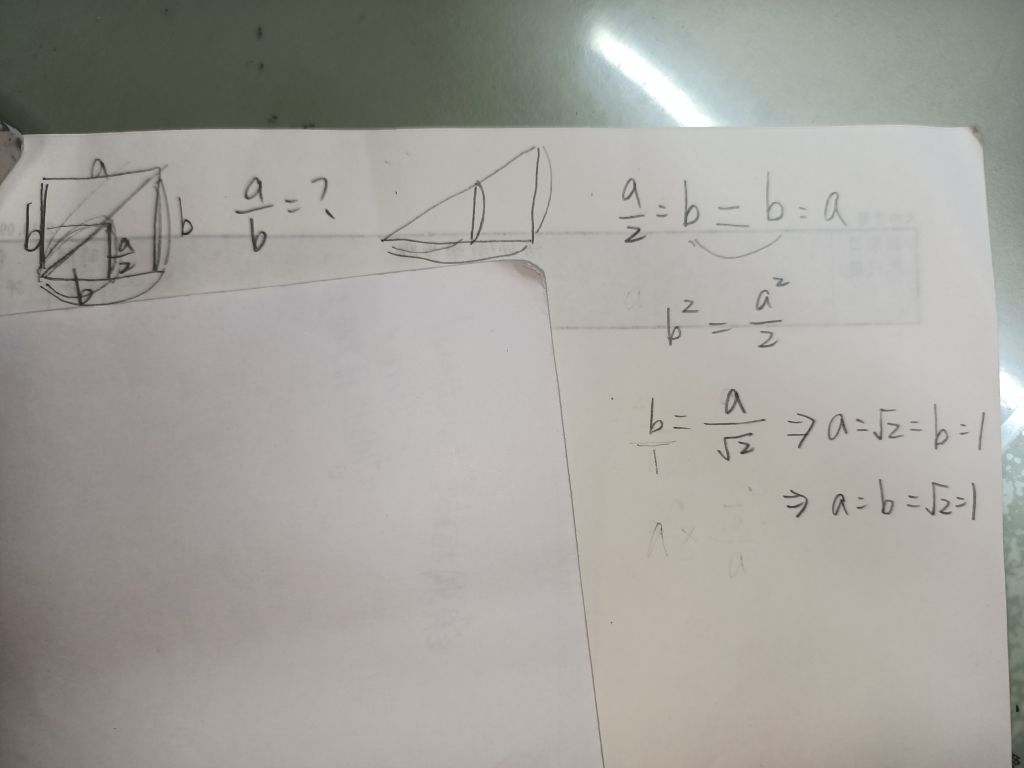 48. 將一張 A4 紙張對摺剪開變成兩張 A5 紙張(如下圖甲)。各取一張 A4 與 A5 紙張,沿著對角線對摺,然後將 A5 紙張疊 A4 紙張上(如下圖乙),居然兩張紙張的對角線會疊在一起形成共線。求 A4 紙張的長邊與寬邊之比 為何?
