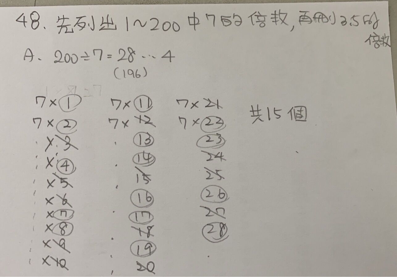 48. 將 3 的倍數、5 的倍數從自然數 1、2、3、……、200 中移去,剩下的自然數中有幾個是 7 的倍數?