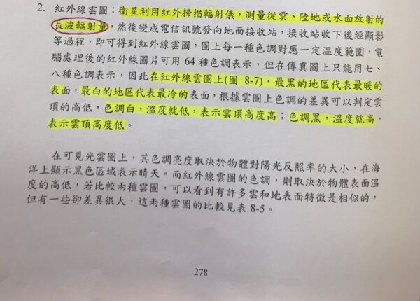 (B)紅外線雲圖係測量從雲、陸地或水面所放射的長波輻射