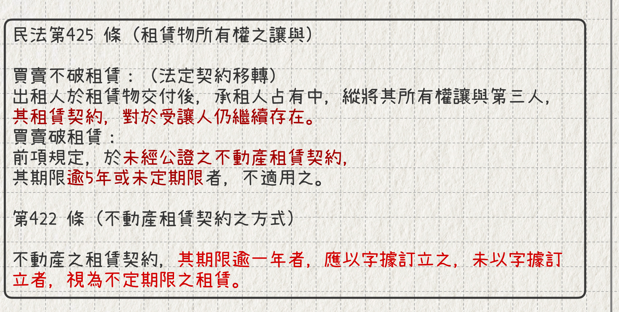 民法§ 425 第 1 項:「出租人於租賃物交付後,承租人占有中,縱將其所有權讓與第三人,其租賃契約,對於受讓人仍繼續存在。」