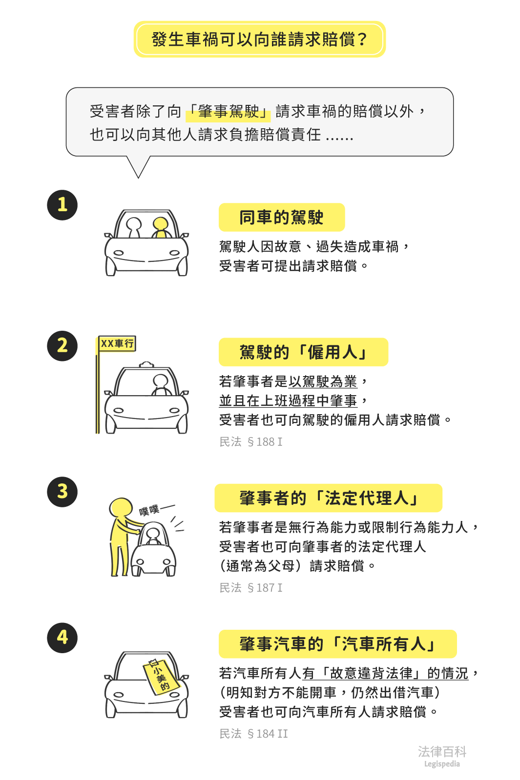因此,車禍發生時除了向「肇事者」求償以外,還有可能向上述對象請求賠償。