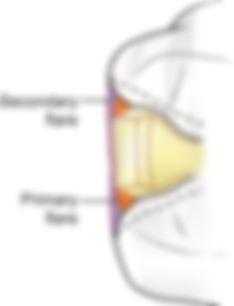 49.鑄金嵌體窩洞設計中,第二級外展(secondary flare)使用於那一個位置?