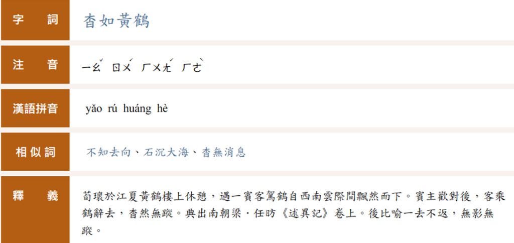 杳如黃鶴:比喻一去不返,無影無蹤。