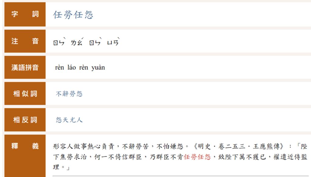 | 任勞任怨 | 形容人做事熱心負責,不辭勞苦,不怕嫌怨。 |