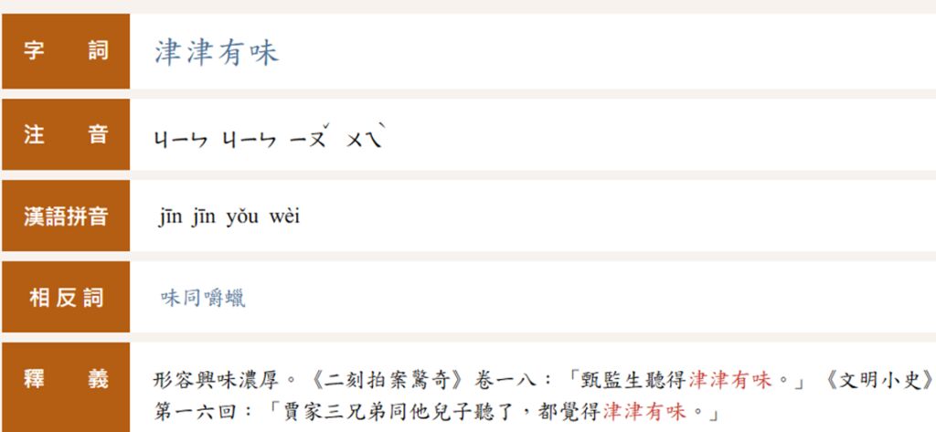 | 津津有味 | 1形容興味濃厚的樣子。 2形容食慾盎然或食物的美味 |