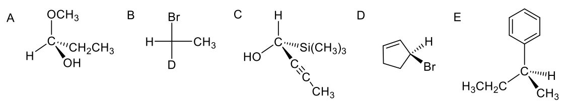 5. 化合物 A 至 E 具有對掌性碳原子(chiral carbon),哪個選項所標示的絕對組態 (absolute configuration)完全正確?