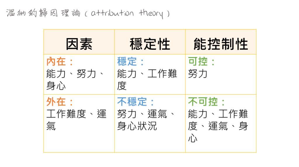 習得無助感來自學生認為自己能力不足,以溫納之歸因理論屬穩定不可控制。