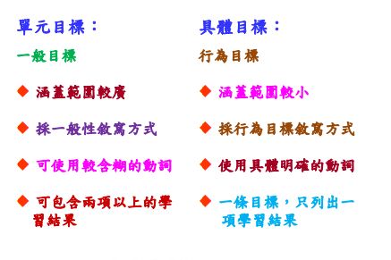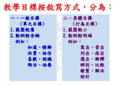 「可觀察的行為目標」是指學生在學習後,能夠具體展現出來的行為,通常能被觀察或測量。這樣的行為通常用動詞表示,例如: