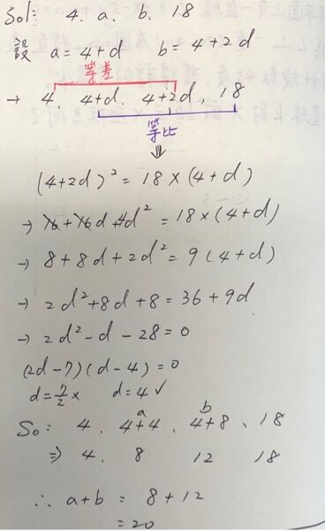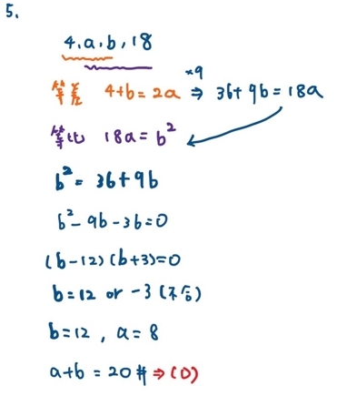 5. 設a,b都是正數。若四數4,a,b,18中,前三項依序形成一等差數列,後三項依序形成一等比數列,則a+b=?