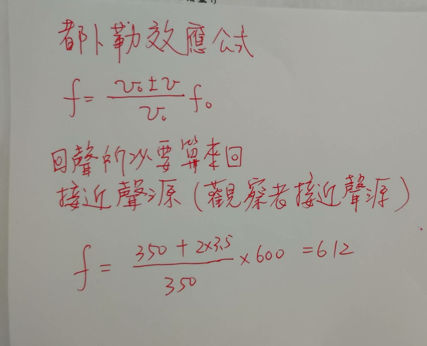 5. 警車的駕駛聽到從牆壁上傳回來警車所發出警報器的回音,警車以 3.5 m/s 的 速率向牆壁行駛。如果聲速為 350 m/s,警報器的頻率為 600 Hz,則駕駛聽到 的回音的頻率最接近以下何者?
