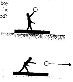 5. A boy stands on a board placed on a ice (frictionless). The mass of the boy including the board is 20 kg. When he throws a ball with mass of 1 kg to the right at the speed of 10 m/s (Fig. 2), what is the velocity of the boy and board?