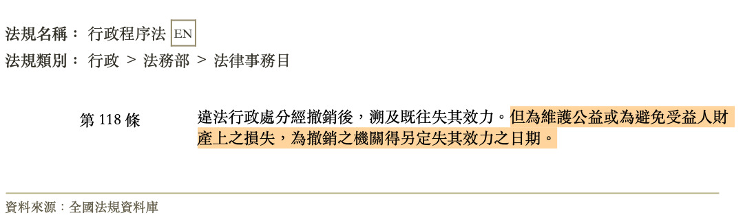 違法行政處分於法定救濟期間經過後,原處分機關得依職權為全部或一部之撤銷