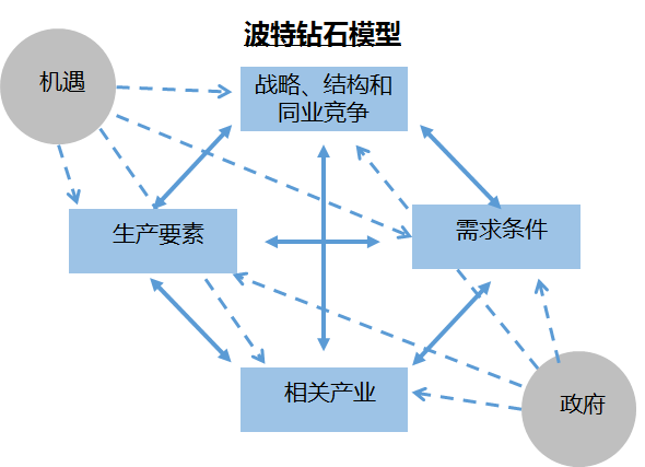 (D)波特鑽石模型理論(Michael Porter diamond Model):又稱國家競爭優勢鑽石理論。鑽石模型是由美國哈佛商學院著名的戰略管理學家波特所提出。波特的鑽石模型用於分析一個國家某種產業為什麼會在國際上有較強的競爭力。波特認為,決定一個國家的某種產業競爭力有四個因素: