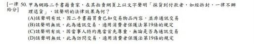 50. 甲為網路二手書籍賣家,在其拍賣網頁上以文字聲明「採貨到付款者,如經拆封,一律不辦 理退貨」,該聲明的法律效果為何?