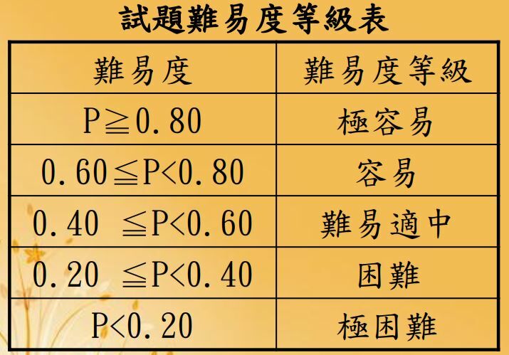 P表示題目的難度指數,P值越大,難度越低;P值越小,難度越高。