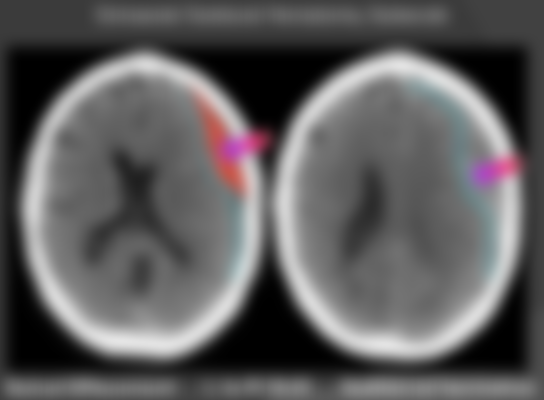 心跳 90/分,GCS 昏迷指數 8 分(E1M5V2),左側瞳孔放大(左:6 mm,右:3 mm 直徑),右側 肢體偏癱。其緊急電腦斷層掃描如下圖,則這位病患最有可能的臨床診斷是:
