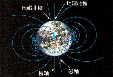 目前地球外部磁場由南極S至北極N(圍繞地表的磁力線方向),因此內部(南北極通過地球球心的貫通線段)可假想為是南N-北S的磁鐵棒。