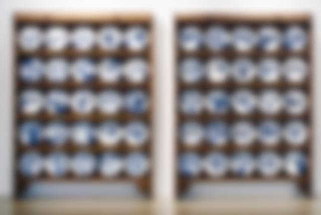 于一蘭,《擺桌》,瓷盤、柚木櫃、平面輸出影像,2013,桃園市立美術館典藏。(桃園市立美術館提供)ㅤㅤ