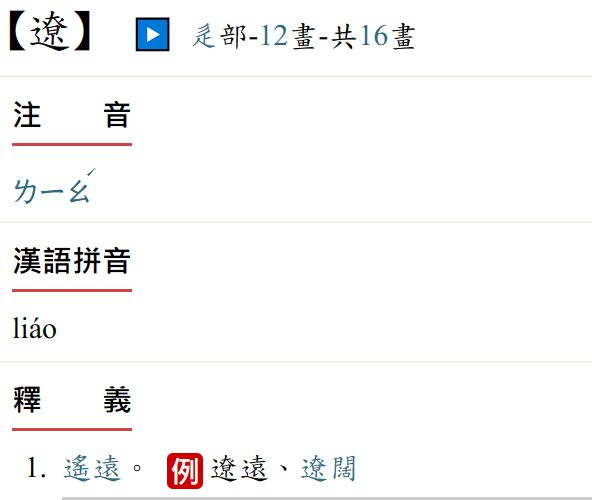 遙遠、開闊。如:「遼ㄌㄧㄠˊ」望