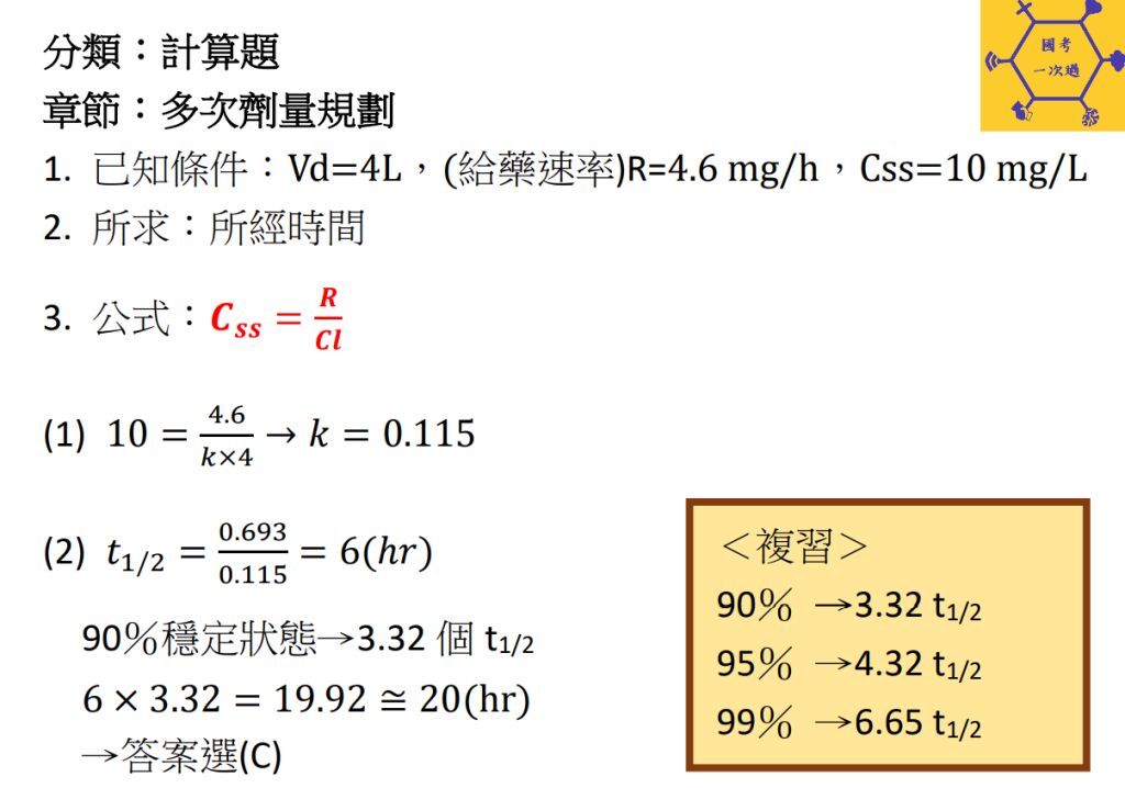 54.某藥物之體內分布體積為4 L。以 4.6 mg/h速率經由靜脈輸注方式給藥,達穩定狀態之血中濃度為10 mg/L。若
