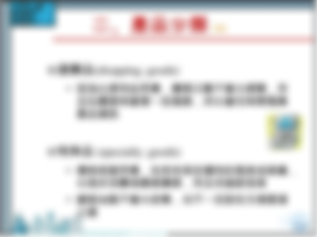 - 便利品:消費者較常購買、立即購買,且不會花很多時間去比較的消費品。又細分為日常用品、衝動性購買及緊急用品。