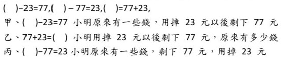 54. 老師佈了一個問題「小明原來有一些錢,用掉 23 元以後剩下 77 元,問小明原來有多少元?」有三個算式如下:甲、( )−23=77 乙、77+23=( ) 丙、( )−77=23 若依題意列式或者經過語意轉換後列式。問哪些算式是合理的?