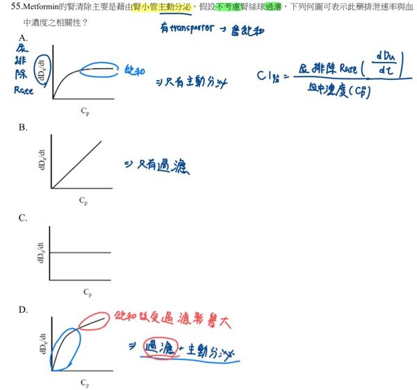 55.Metformin的腎清除主要是藉由腎小管主動分泌,假設不考慮腎絲球過濾,下列何圖可表示此藥排泄速率與血 中濃度之相關性?
