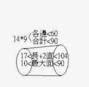 (B)最大限制,成捲者,其長度及直徑之2倍,合計以104 公分為限,最大一面之尺寸不逾90公分