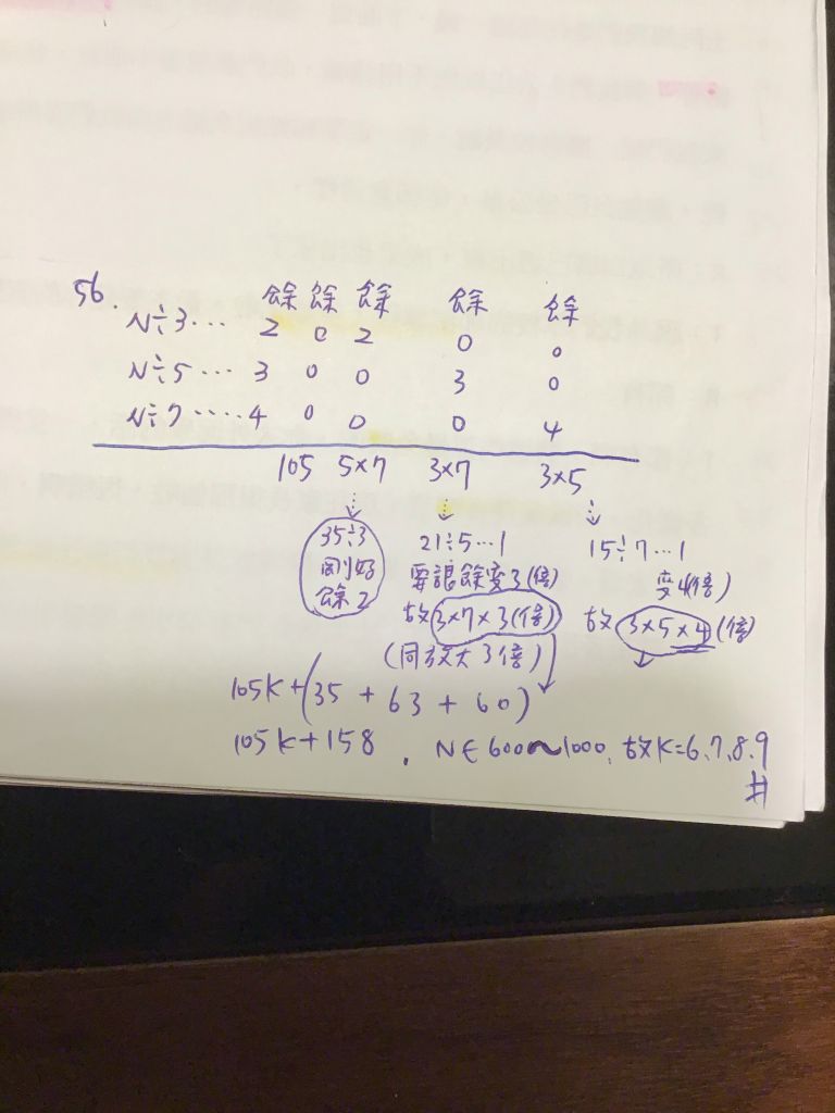 56.設有一自然數N介於600與1000之間,已知N除以3剩餘2,N除以5剩餘3,且N除以